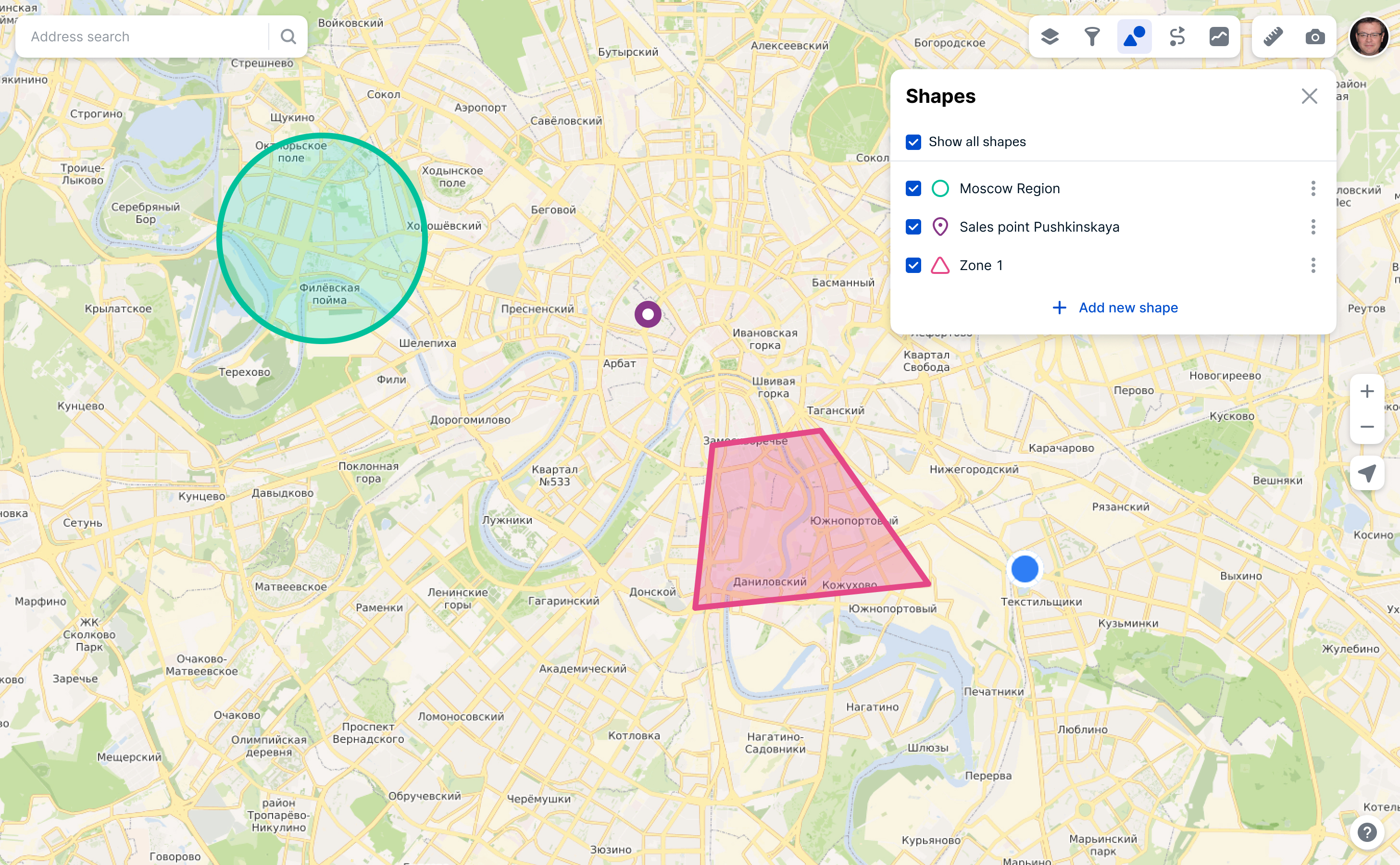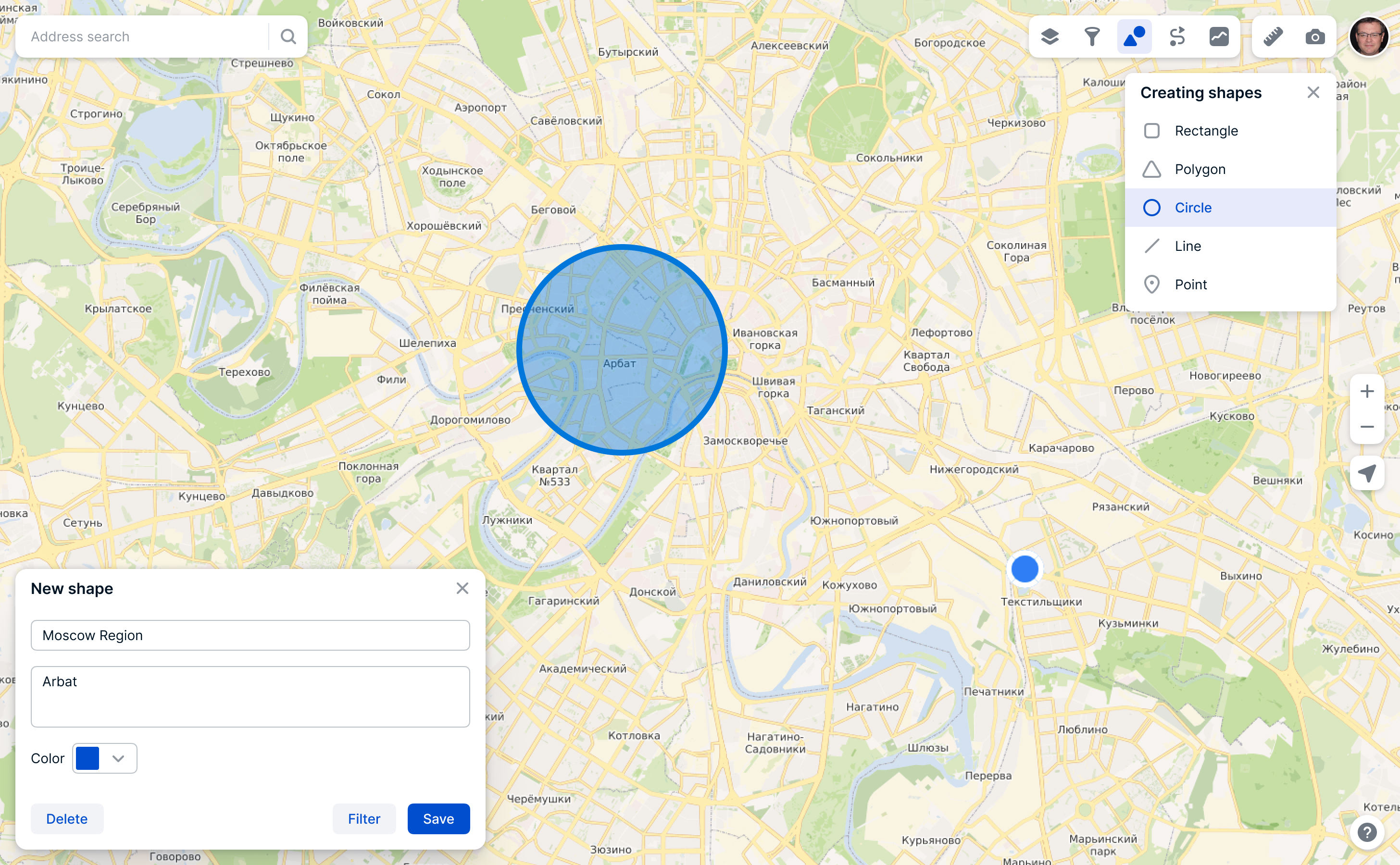 You can use shapes to quickly mark something you need so that you won’t lose it later. You can also filter objects by shapes. For example, you can set the point of the desired trade showroom and see what competitors’ showrooms are within a certain radius.