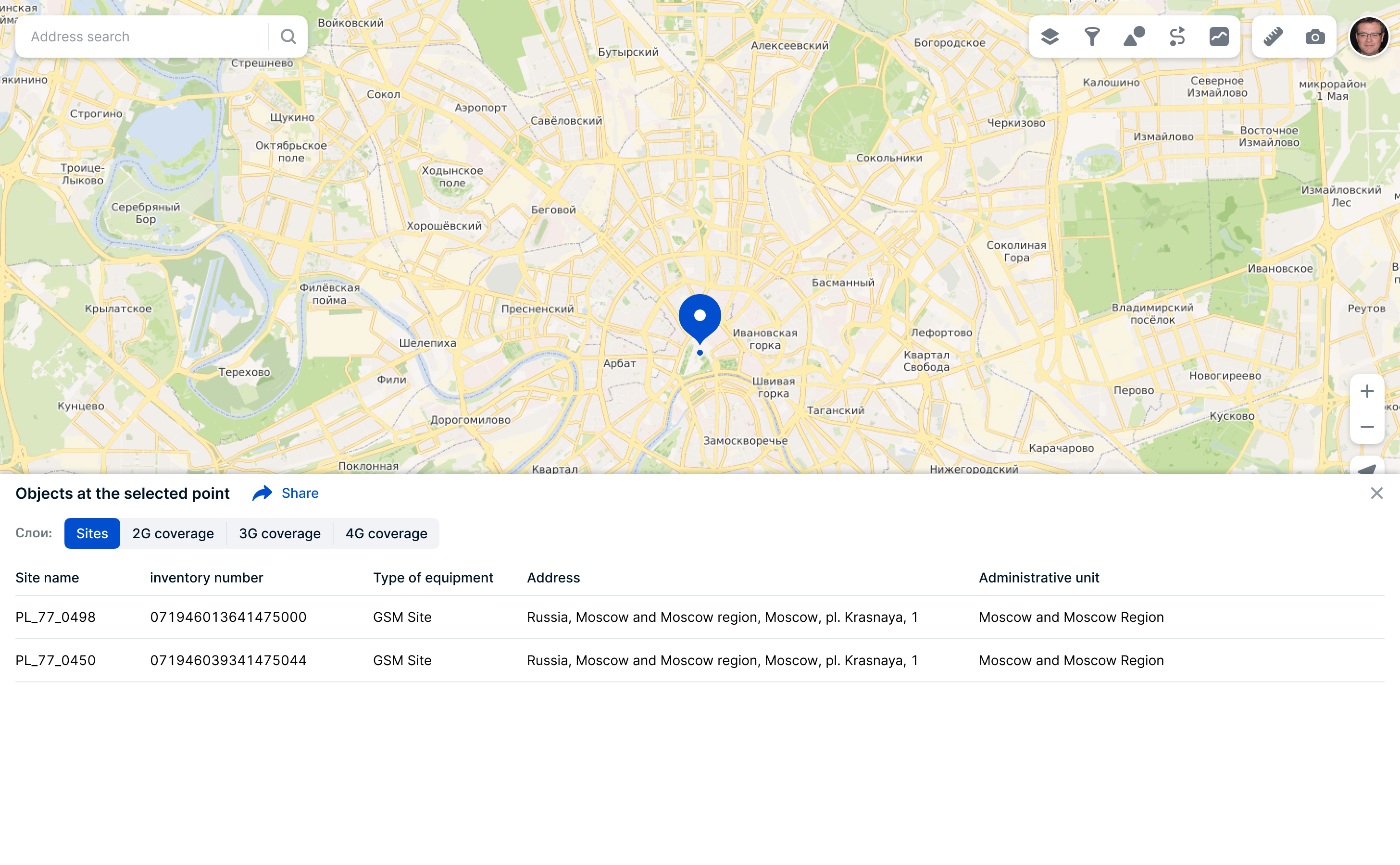 Clicking on any point on the map displays information about the objects in this point. There can be several objects from different layers in one point. After user tests, I have chosen a tabular option for displaying information about objects. This way it is much faster to find the desired object and compare it with others.