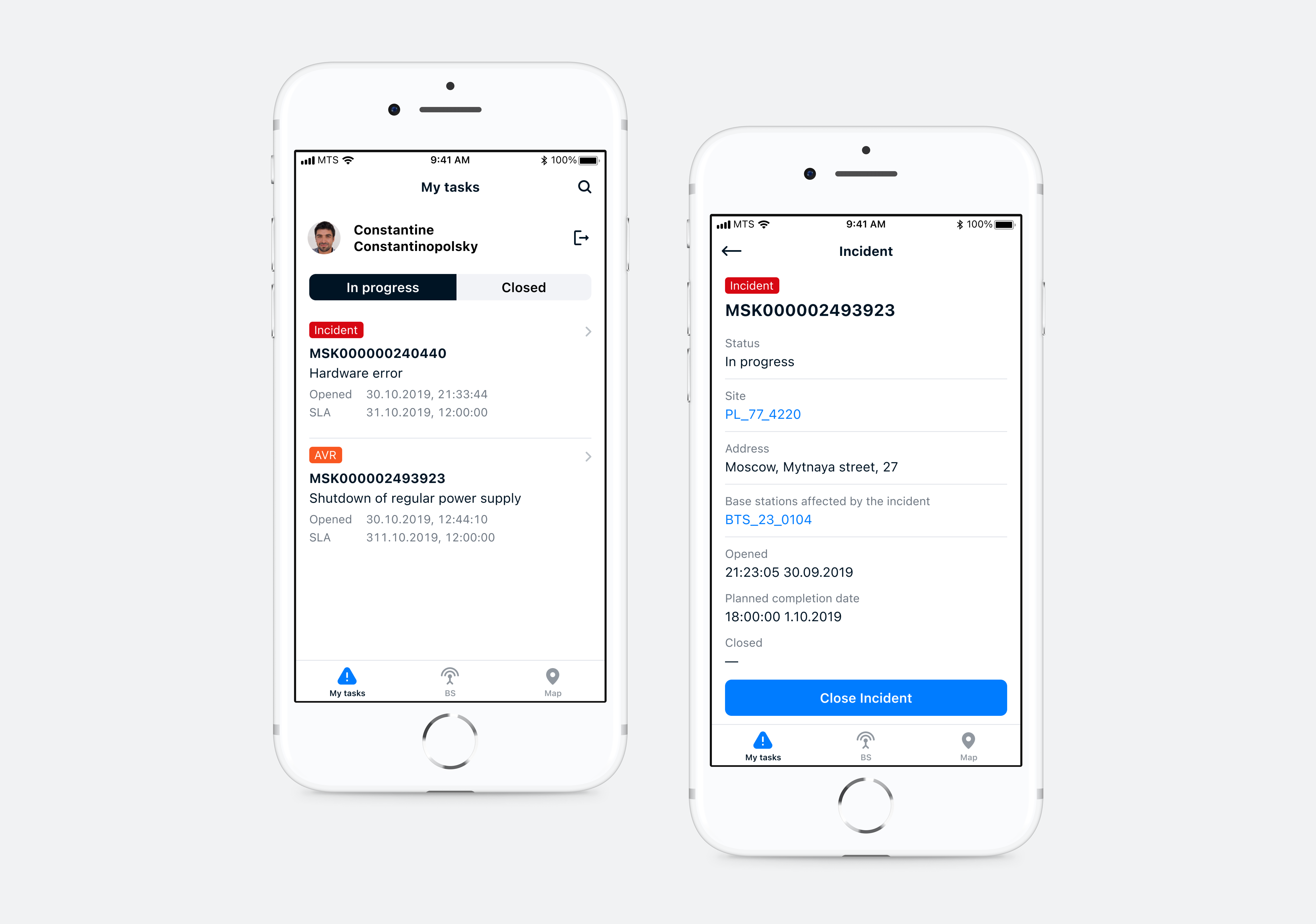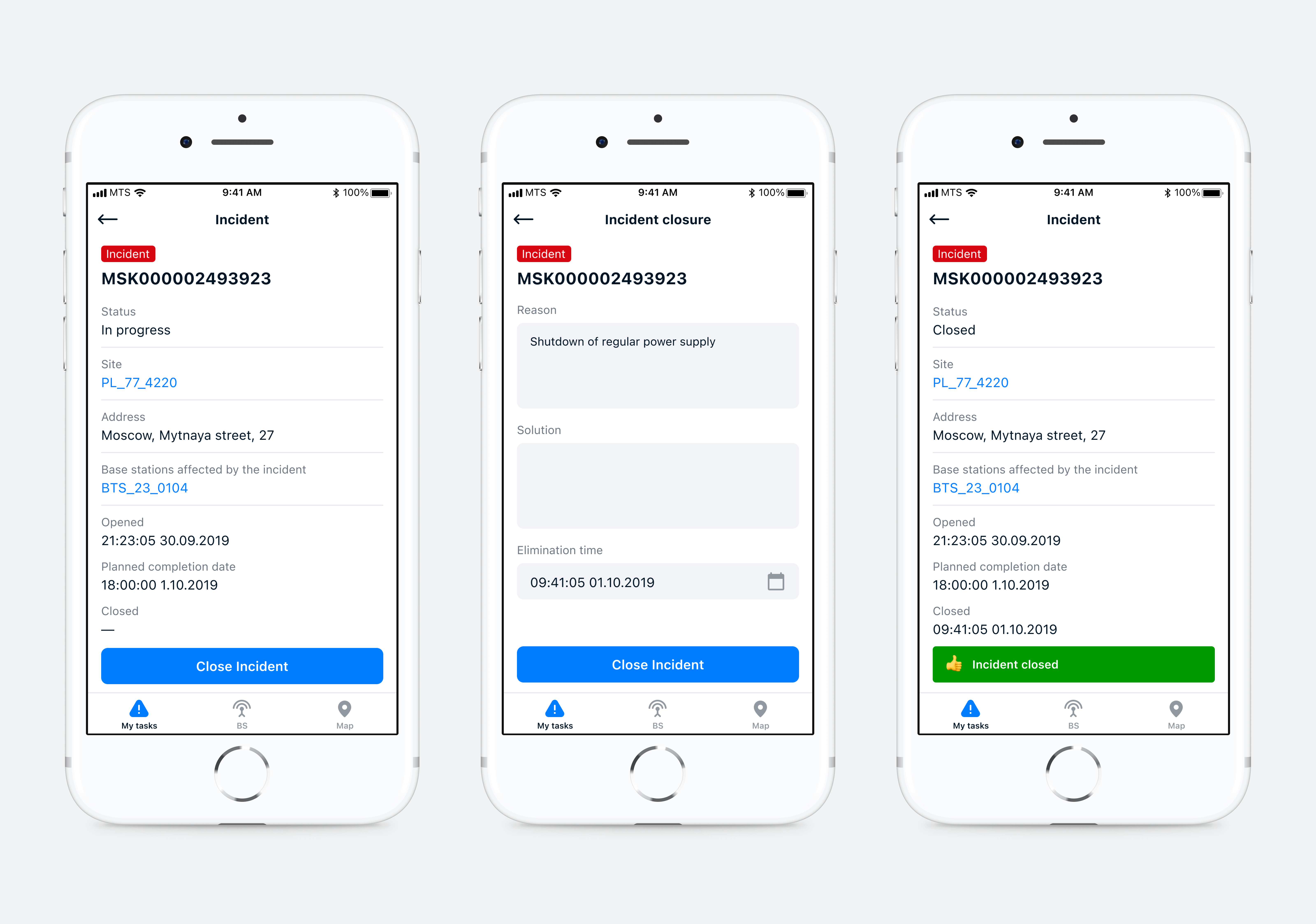 The engineer receives a push notification of a new task. The application shows all user tasks: incidents (urgent serious accidents) and emergency repair work (planned work and non-serious equipment breakdowns). The task card has all the necessary information: the site number and address where the equipment is located, the time of closure, and the base station to be repaired.